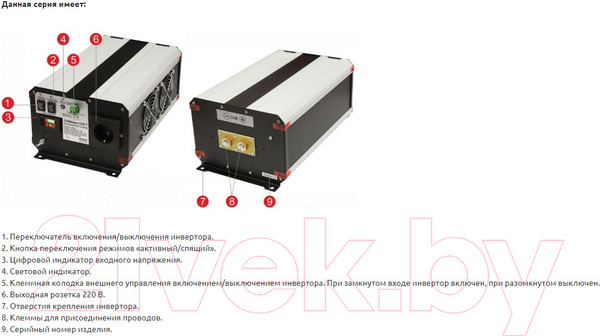 Улучшенные параметры электромагнитной совместимости. Прибор наводит меньше помех, как на непосредственно подключенную к нему нагрузку, так и на приборы, восприимчивые к помехам по радиоканалу.Наличие режима энергосбережения (спящий режим). В случае отсутствия нагрузки, инвертор при наличии установки тумблера в положении «спящий», перейдет в режим пониженного энергопотребления. При появлении нагрузки более 45 Вт инвертор восстановит рабочее состояние.Встроенные защиты:- Защита от попадания 220 В на выход инвертора. В случае возникновения встречного напряжения (220 В от другого источника) инвертор не выйдет из строя. Прибор непрерывно контролирует появление встречного напряжения и в случае его обнаружения немедленно отключится от нагрузки. Инвертор продолжит проверять наличие встречного напряжения включаясь, приблизительно каждые 20 сек., до устранения неисправности.