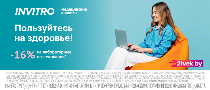 Купон ИНВИТРО получат клиенты, совершившие покупку в 21vek.by с 20 сентября по 15 октября 2024 года. Использовать купон на скидку пациент может до 20 октября 2024 года включительно, предъявив его в электронном или печатном виде администратору медицинского офиса.