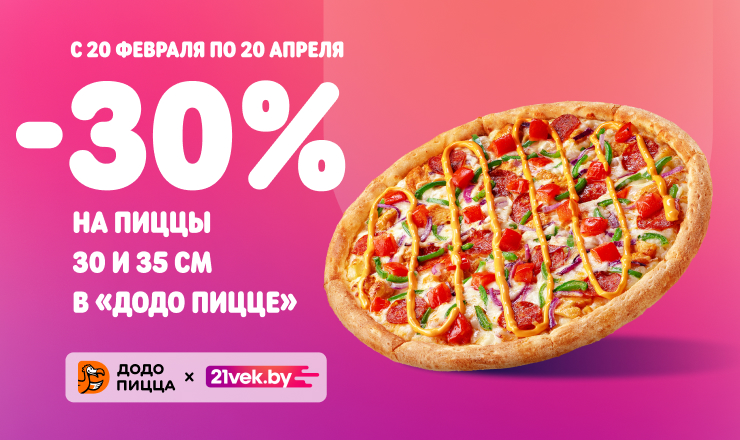 Додо Пицца дарит всем покупателям 21vek.by скидку 30% на пиццы 30 или 35 см по промокоду 21DODO