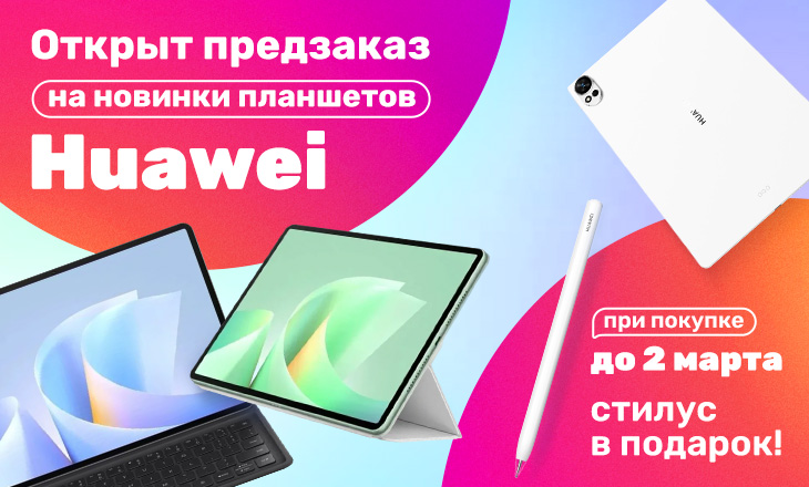 Рады сообщить вам об открытии предзаказа на новинки планшетов Huawei. При заказе планшета Huawei MatePad, вы получите стилус Huawei M-Pencil Pro в подарок!