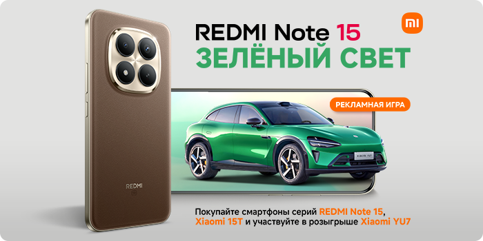 В период с 9 февраля 2026 по 29 марта 2026 включительно — приобретайте смартфоны серии Redmi Note 15 или Xiaomi 15T/15T Pro и получите шанс выиграть умную технику и автомобиль Xiaomi YU7!