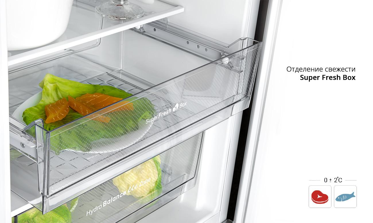 Для максимально долгого сохранения продуктов свежими, предусмотрено еще одно отделение — Super Fresh Box. К примеру, если вы покупаете мясо, но готовить его собираетесь только в выходные, то лучшего места хранения, чем холодильник с отделением свежести для мяса и не найти. Оно поддерживает особые условия, в которых медленнее всего размножаются бактерии: при температуре около 0°C и оптимальном уровне влажности.