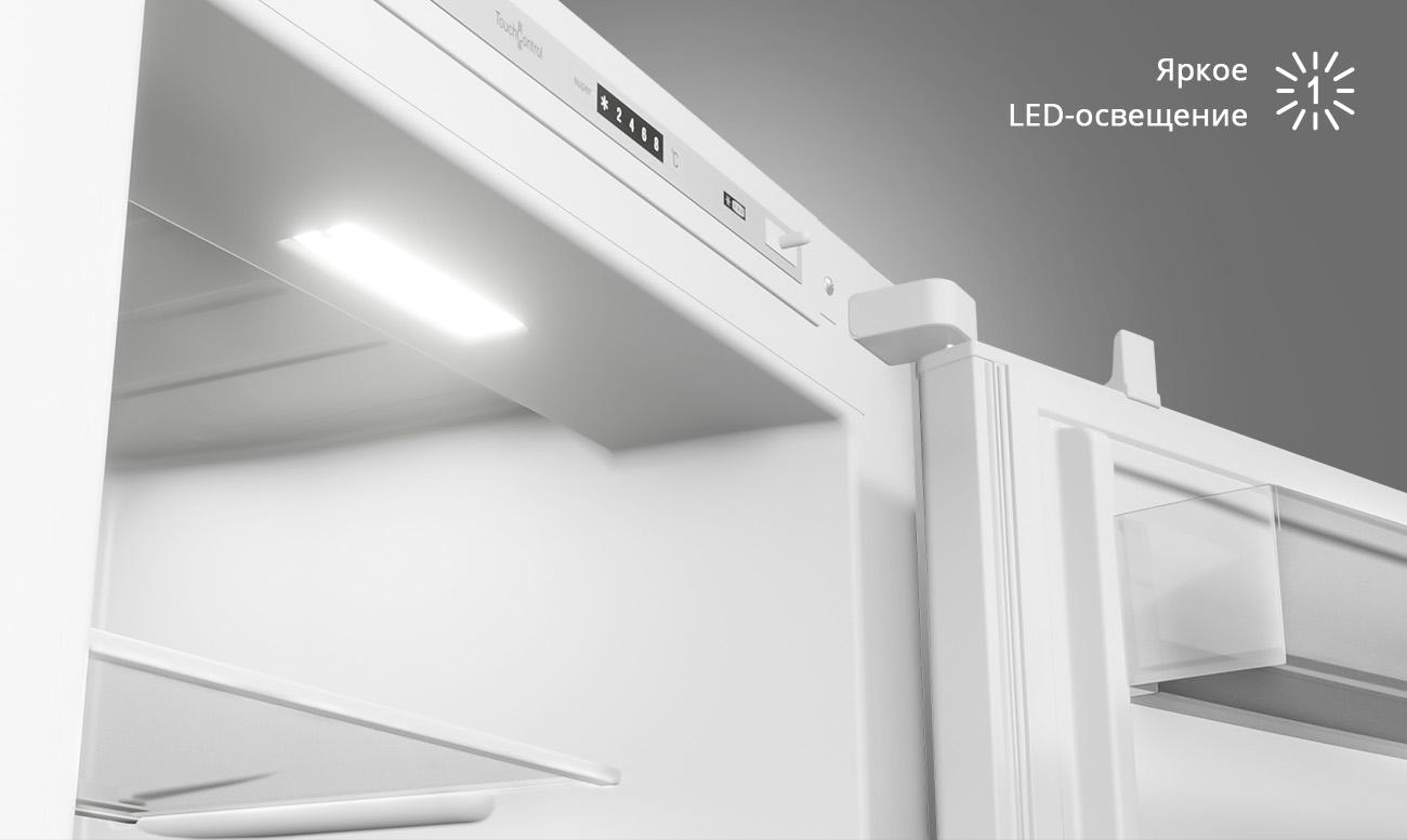Открывая дверцу холодильника, сразу можно окинуть взглядом все его содержимое, которое подсвечивается приятным равномерным светом светодиодной лампы. LED-лампа подсвечивает продукты, облегчая выбор самого вкусного.