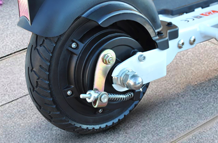 Барабанный — барабан находится внутри колеса, при нажатии на рукоятку прижимается к колодкам. Не боится грязи и падений, однако сильно нагревается, поэтому его не рекомендуют ставить на мощные самокаты. Плюс он значительно повышает вес устройства, недолго служит и периодически требует замены колодок.