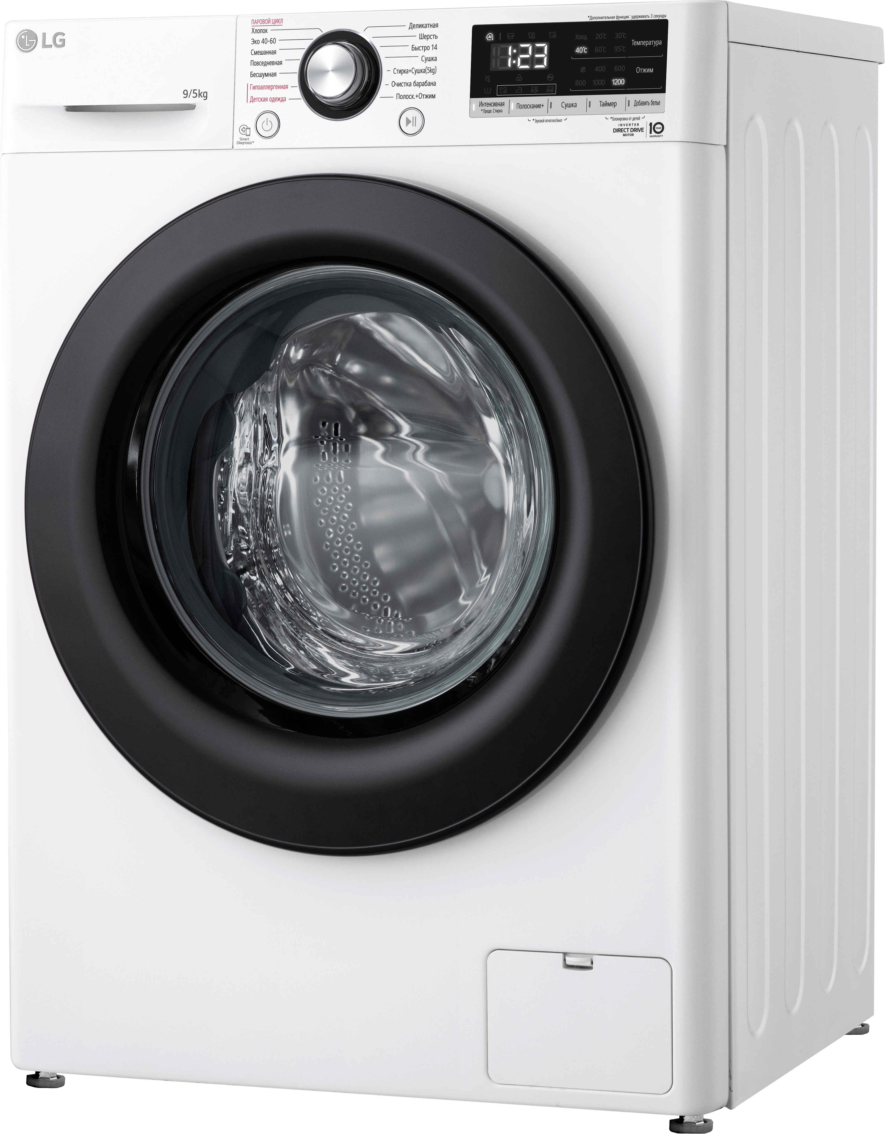 LG F2V3FR6W (стирально‑сушильная) — 9 кг стирки / 5 кг сушки