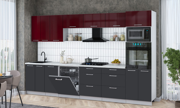 Кухонный гарнитур Интерлиния Мила Gloss 3.4-ПМ1-2 (пепел/бордовый глянец/серый каспий)