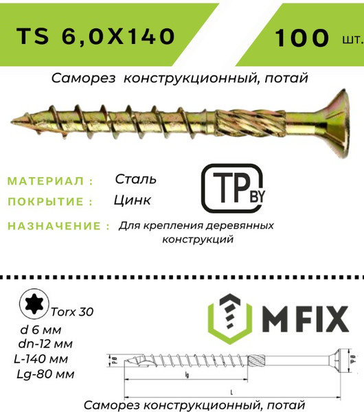 Саморез MFIX Конструкционный потайной по дереву 6.0х140 TORX 30 (100шт)