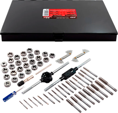 Количество в наборе 60 шт. Марка стали быстрорежущая ( HSS) Направление резьбы правосторонняя Диаметр резьбы метрический М3, М4, М5, М6, М10, М12, М8, М9 Диаметр резьбы дюймовый 1/8", 1/4", 1/2", 7/16", 5/16", 3/8"